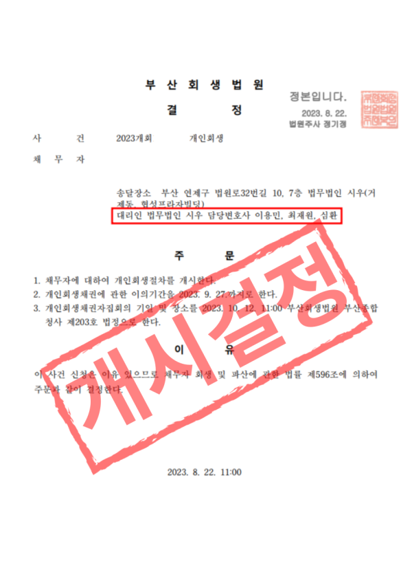 [개인회생] 개시결정(2023개회******)