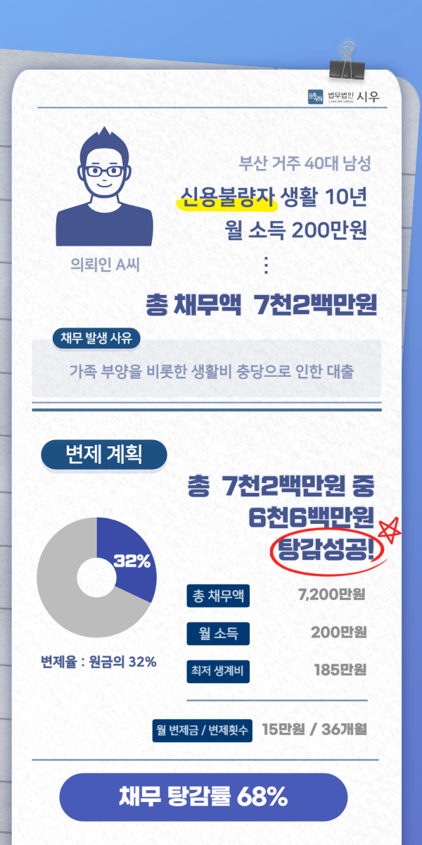 급여 감소로 채무를 제때 갚지 못하게 되자 신용불량자로 10년의 시간을 보내다 긴 시간 채무가 과중하여 개인회생을 신청하게 되었습니다.