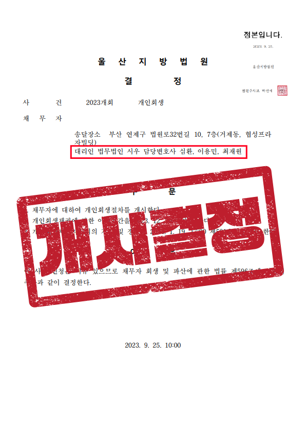 사업장 운영으로 인해 발생한 국세, 지방세, 4대보험 미납금 등의 조세 미납 채권을 포함하여 변제계획안을 제출하여 개인회생 개시결정을 받게되었습니다.