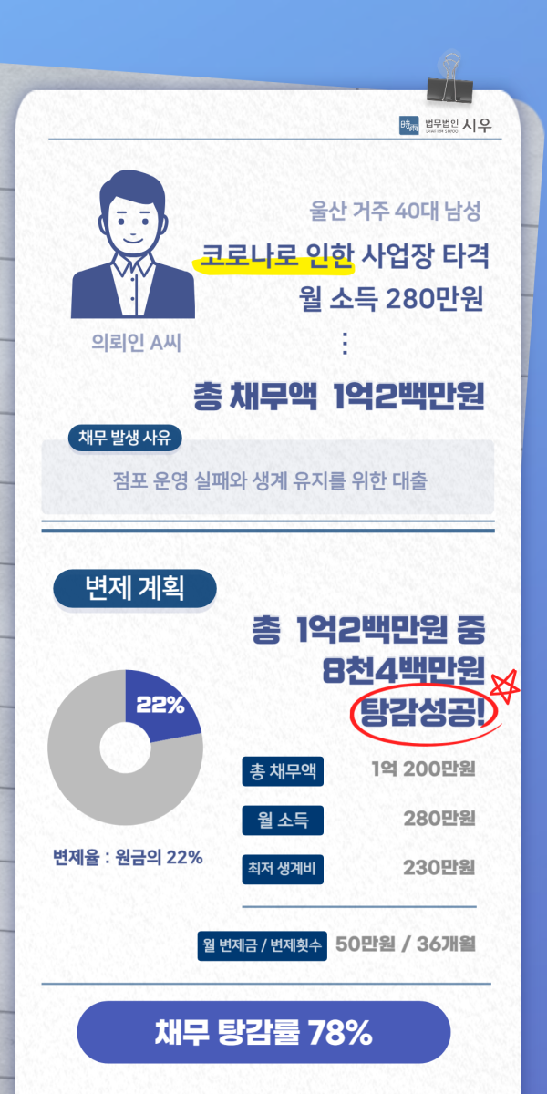 지속적인 경영난으로 눈덩이처럼 불어난 채무를 의뢰인의 소득만으로는 해결할 방법이 보이지 않아 개인회생 신청에 이르게 되었습니다.