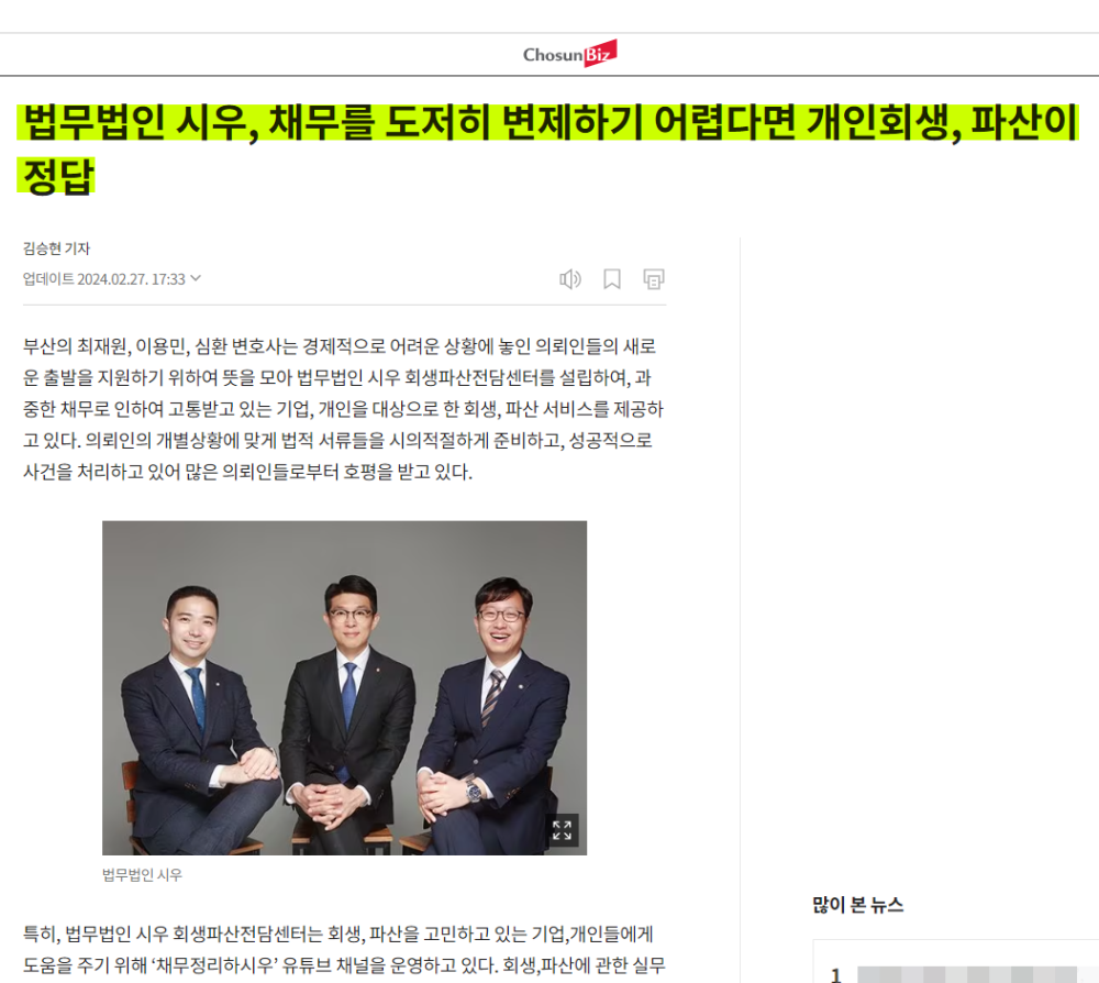 법무법인 시우의 회생파산센터 인터뷰 내용이 조선일보 기사로 업데이트 되었습니다.